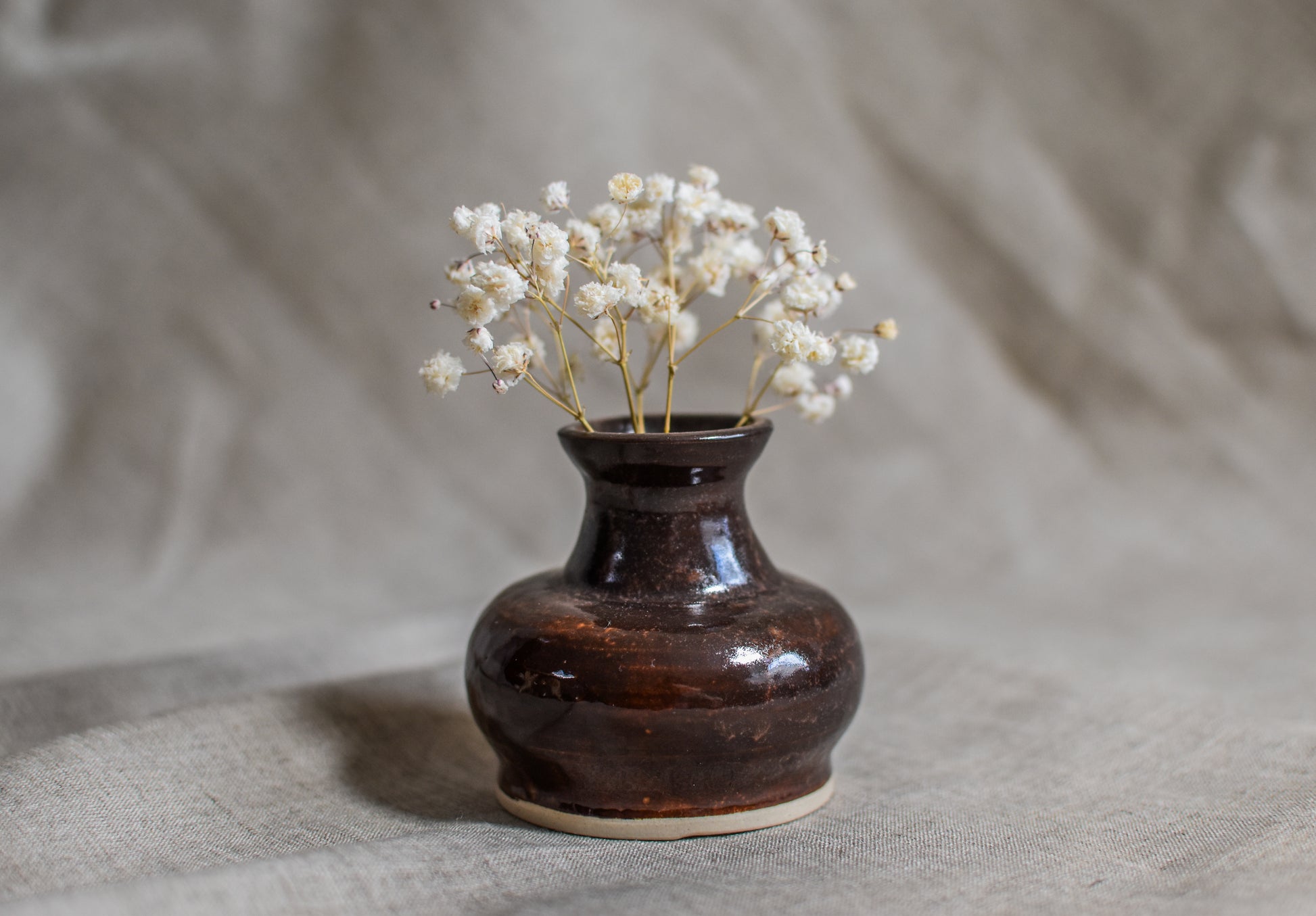 This hand thrown bud vase features a rich cocoa-brown glaze ~ perfect for single stems or as a decorative accent.