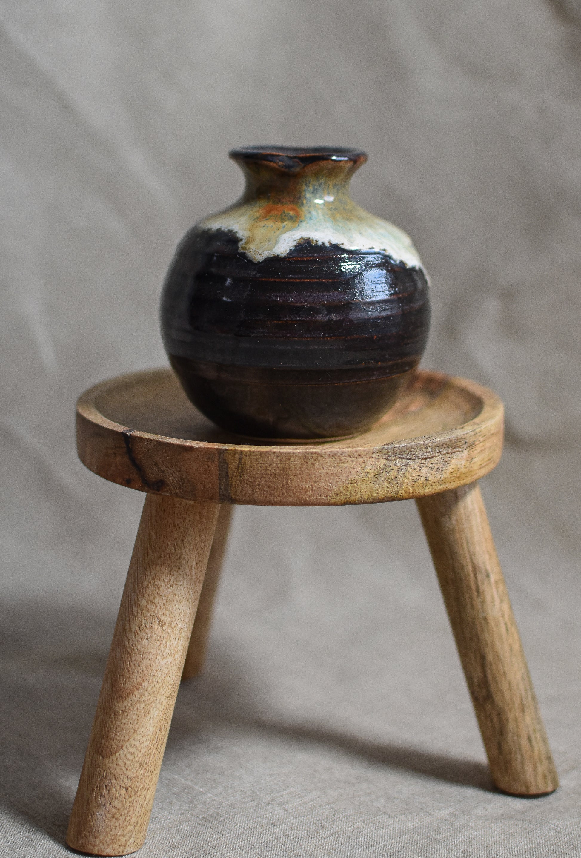 With a dark earthy base and a flowing lighter glaze on top, this piece gives a natural, volcanic look. the compact size makes it ideal for windowsills, bookshelves or on a bedside table.