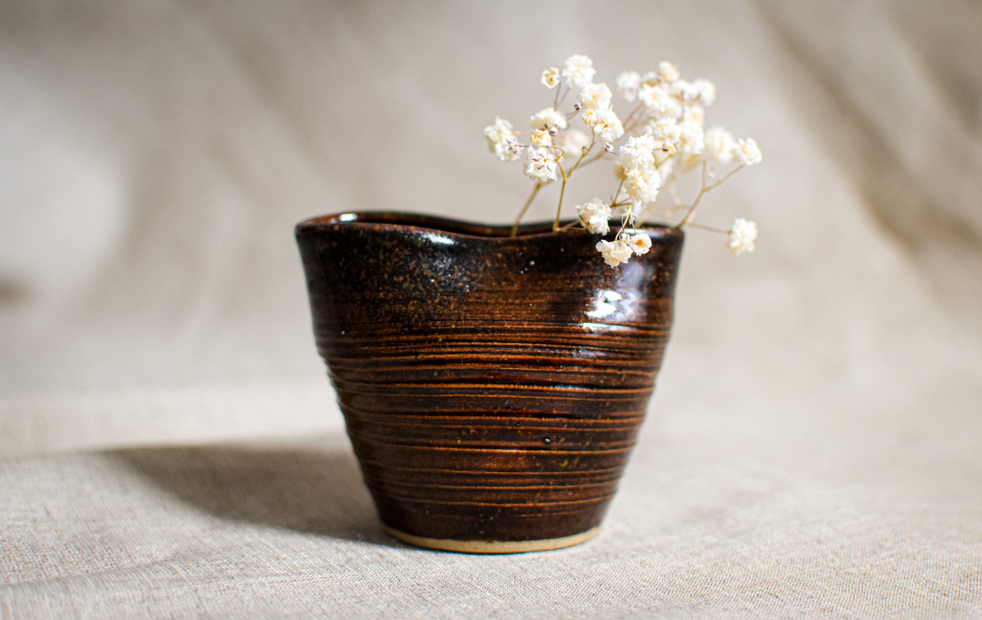 This small handmade vase has a rich, earthy glaze. The deep brown tones with a soft sheen evoke the warmth of ember. Perfect for displaying a few delicate stems or dried flowers.