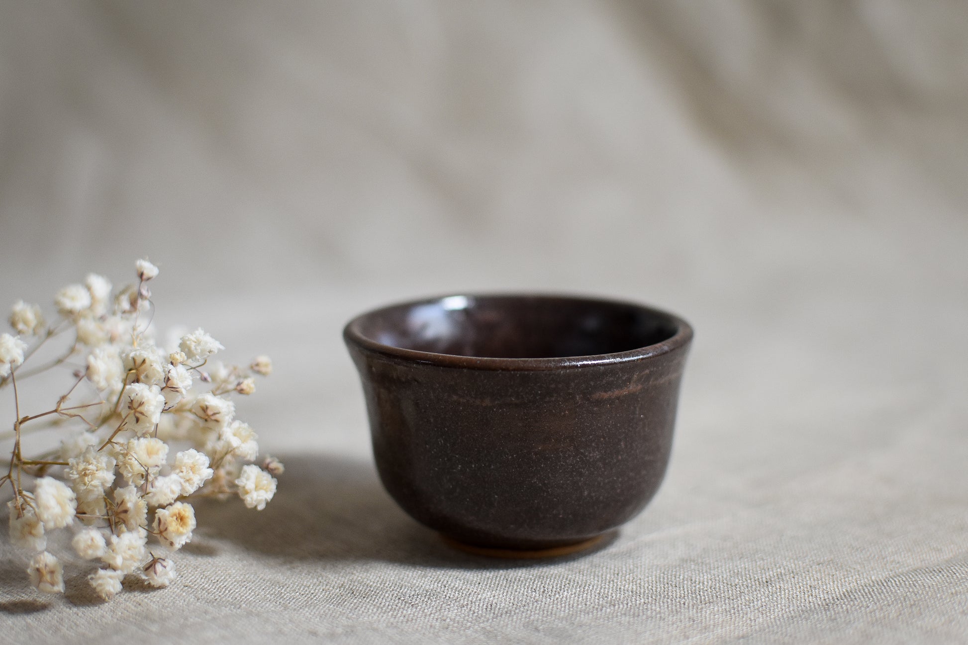 A single wheel thrown ochoko, traditionally used in Japan to drink sake but can also be used for other small servings.