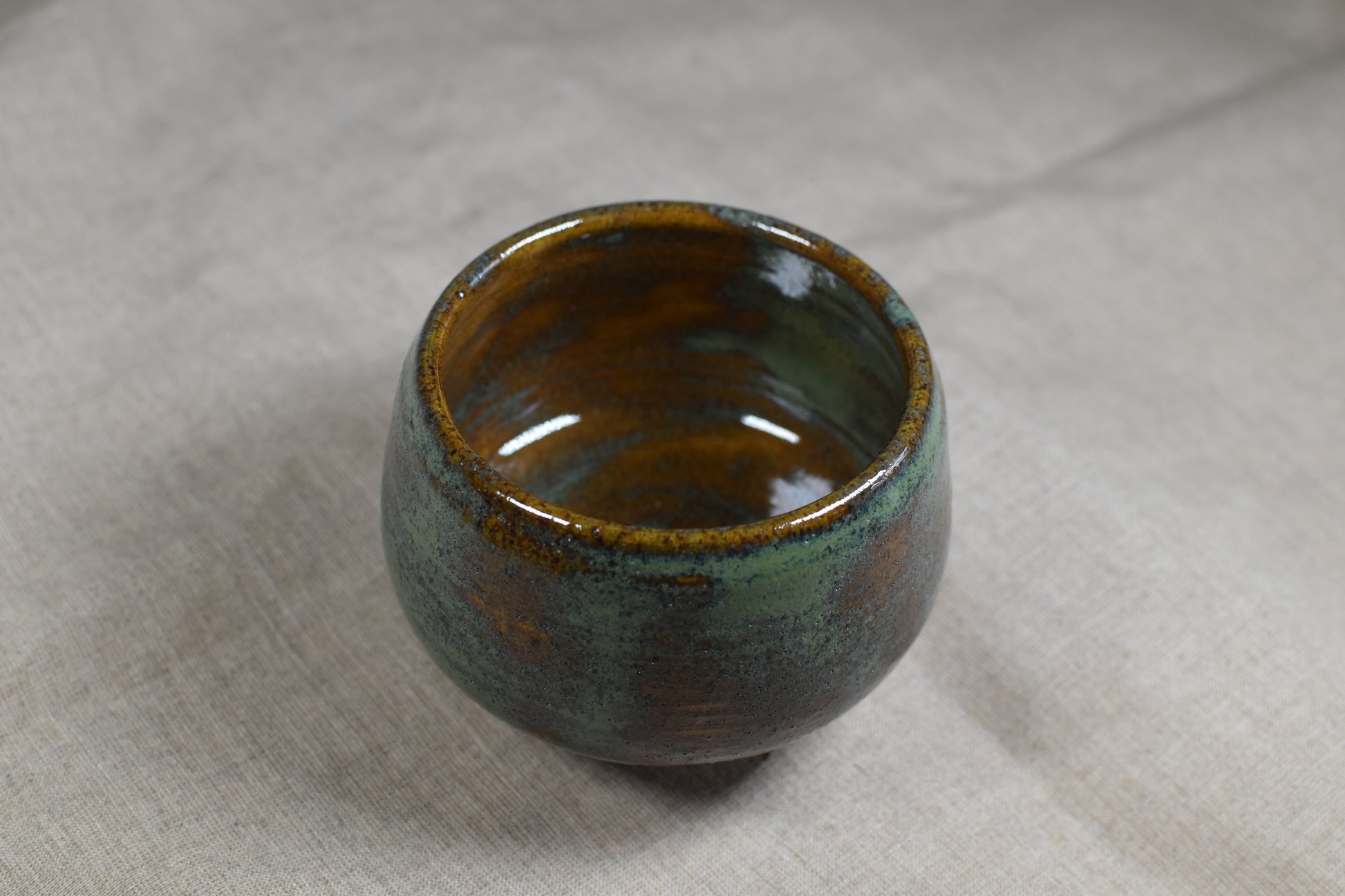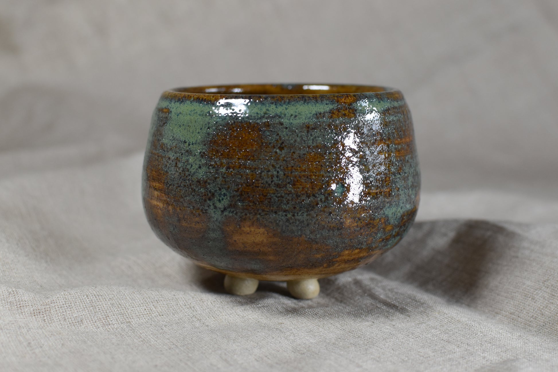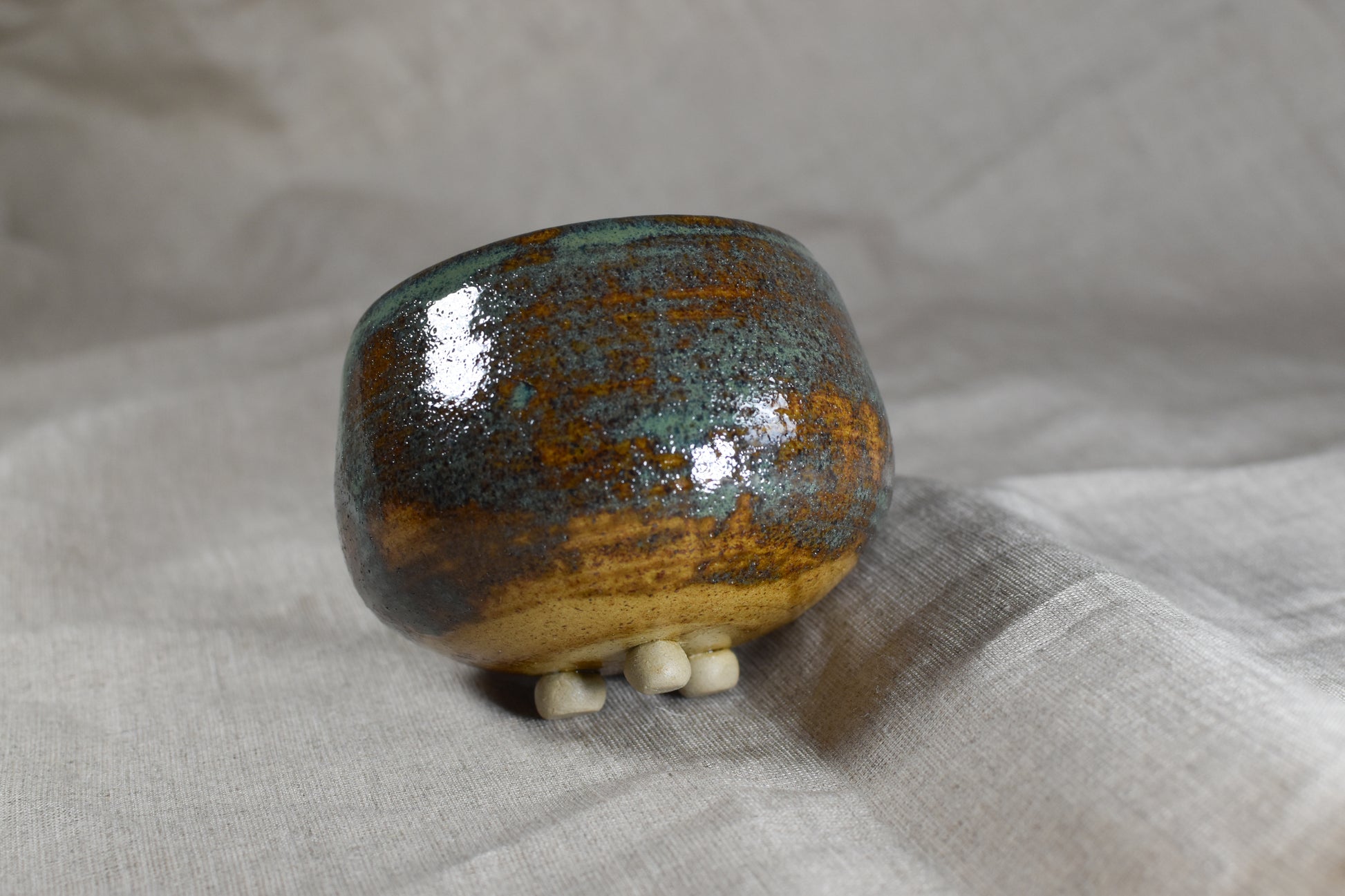 A handmade stoneware pot elevated on three small spherical feet & finished with an earthy glaze.