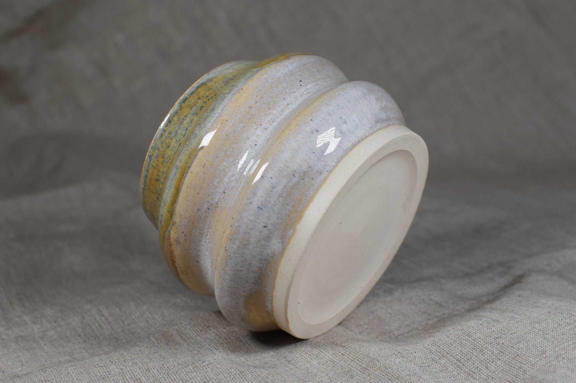 This handmade ceramic pot features a neutral base with a mossy green glaze. Ideal for a plant pot.